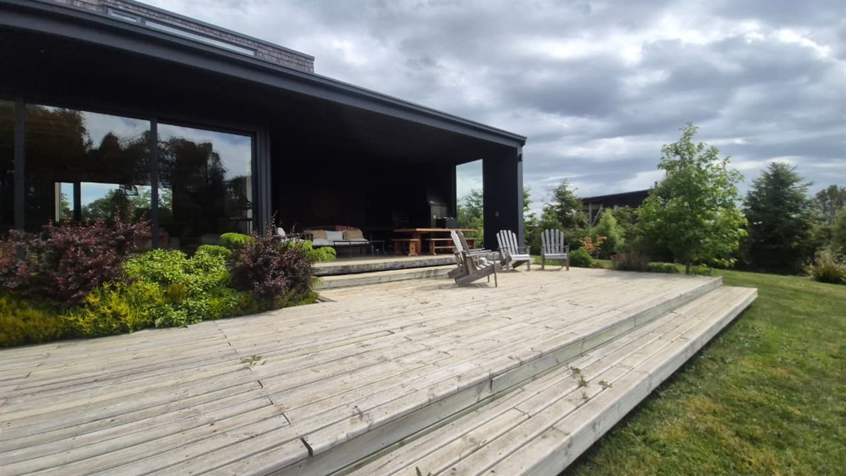 ['Casa de alto estándar en condominio Las Tranqueras, en parcela de 5.000 m² con orientación Norte, sector despejado y bosque nativo, a la altura del km 8 camino a Ensenada, Puerto Varas. Son 408 m² construidos en dos niveles, con 5 dormitorios, 5 baños y bodega independiente.\r', '\r', 'La casa combina estructura de acero y madera, excelentes terminaciones, ventanales termopanel y orientación norte, lo que entrega mucha luz natural y buen confort térmico todo el año. Destacan los espacios amplios, la cocina con isla, el quincho integrado a la terraza y el deck de madera que recorre el frente de la casa, pensados para uso familiar y social.\r', '\r', 'En equipamiento sobresale la calefacción por losa radiante a gas, cocina a leña, sistema de paneles solares que trabaja en conjunto con la caldera y generador eléctrico conectado a la vivienda, lo que asegura autonomía y continuidad de servicio.\r', '\r', 'El condominio ofrece urbanización soterrada, caminos asfaltados, acceso controlado, fibra óptica, quincho común, laguna, senderos y caballerizas, en un entorno de parcelas consolidadas y a minutos de colegios, servicios y del centro de Puerto Varas.']