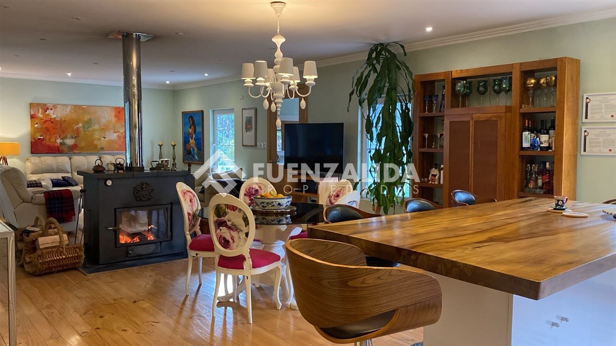 ['Casa en Venta en Ruta 225, Km 7 hacia Ensenada – Entorno Natural, Diseño y Comodidad\r', 'Espectacular casa de 407 m² construidos en un entorno privilegiado, rodeada de árboles nativos y ubicada en un consolidado loteo de parcelas, tranquilo y con excelente conectividad.\r', 'Distribución & Diseño:\r', 'Esta casa de dos pisos cómoda, funcional y conectada con la naturaleza. Su excelente orientación permite disfrutar de abundante luz natural durante todo el día.\r', 'Un amplio living y comedor integrados con una moderna cocina abierta. El espacio perfecto para la vida familiar y social. La cocina, completamente amoblada, incluye un gran mesón isla con cubierta de laurel.\r', 'Primer Piso:\r', '• Amplio dormitorio principal en suite con salida a terraza privada, rodeada de naturaleza.Dos walk-in closets y dos baños completos, uno de ellos con tina de hidromasajes/Jacuzzi y espacio para una sala de estar/escritorio, ideal para teletrabajo.\r', '• Family Room y Baño de visitas.\r', '• Lavadero independiente.\r', 'Segundo Piso:\r', '• Tres dormitorios en suite, cada uno con baño privado y clóset.\r', '• Gran sala de usos múltiples con diversas posibilidades: sala de juegos, estudio o sala de estar.\r', 'Espacios exteriores:\r', '• Terraza cerrada tipo quincho, utilizable todo el año, con vista al bosque del jardín trasero.\r', '• Jardín consolidado y cierre perimetral completo para mayor seguridad y privacidad.\r', '• Estacionamiento techado para 2 vehículos, con cuatro bodegas anexas.\r', 'Equipamiento:\r', '• Ventanas termopanel alemanas de alta calidad.\r', '• Calefacción central a leña mediante combustión lenta doble vidrio que divide el living del comedor.\r', '• Conexión a fibra óptica.\r', '• Acceso controlado mediante portón eléctrico \r', '\r', 'Importante:\r', 'El valor en pesos es referencial.\r']
