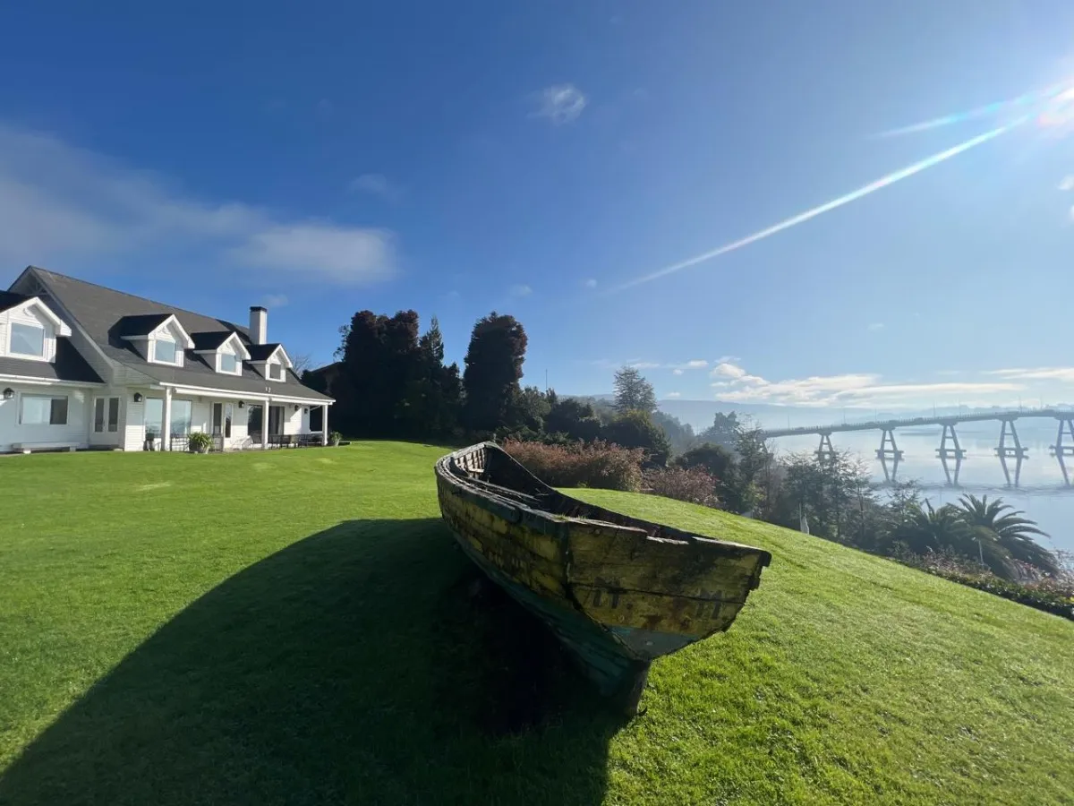 ['Casa emplazada en un espectacular terreno de 4.694 m², con acceso directo a un entorno natural privilegiado y vistas abiertas al Rio Valdivia y Puente Cruces, La propiedad ofrece una superficie total de 560 m² distribuidos en casa principal de dos niveles, casa cuidador, quincho, garaje, todo esto integrando ambientes que destacan por su relación con el paisaje exterior y las áreas verdes. \n\nEl diseño contempla un amplio living con ventanales que permiten apreciar completamente la vista al rio, dispone de comedor independiente con acceso directo al exterior y una cocina equipada que incluye muebles en tonos blancos, múltiples espacios de almacenaje y artefactos a la vista. \n\nLa casa cuenta con seis dormitorios, algunos de ellos con vistas directas al rio, además de cinco baños. En el exterior se encuentra una piscina de forma rectangular rodeada de un deck y jardinería con orientación hacia el rio. Existen además áreas habilitadas para actividades sociales, como una quincho techado con barra, parrilla y ventilador de techo.\n\nDestacan los accesos con portón automático y una zona de estacionamiento techado, complementando la funcionalidad del inmueble. La propiedad dispone de muelle propio y embarcadero cubierto, configurando un espacio apto tanto para actividades náuticas como el disfrute del entorno natural.']